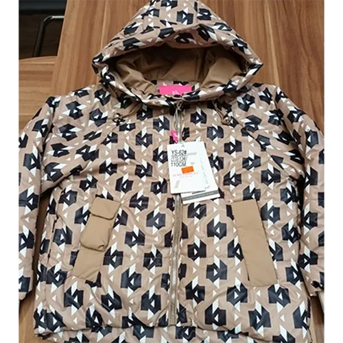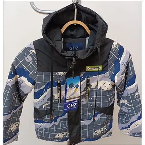 Jachetă destinată copiilor de vârstă mică, cu un top din material textil de culoare crem matlasat cu dungi orizontale, imprimat cu figuri obișnuite alb-negru. Hota utilizează un șnur elastic funcțional sub forma unei bucle, capetele buclelor ies liber cu aproximativ 7 cm.