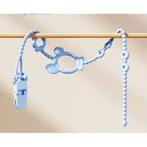 Suport pentru suzetă albastră, fabricat din material siliconic. Produs vândut online, în special prin intermediul Shein (identificator unic: sa2409116296789668).