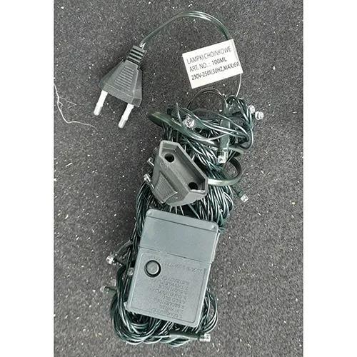 Lanț de iluminat format din 100 de LED-uri, o unitate intermitentă, marcaj IP44, un dop plat și o priză plată, stivuitoare.