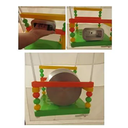 Leagăn agățat pentru copii din plastic. Sistemul de agățare constă dintr-o frânghie care este ancorată în fiecare colț al leagănului și se termină în doi conectori cu inele metalice. Produs vândut online, în special prin intermediul www.dracik.sk.