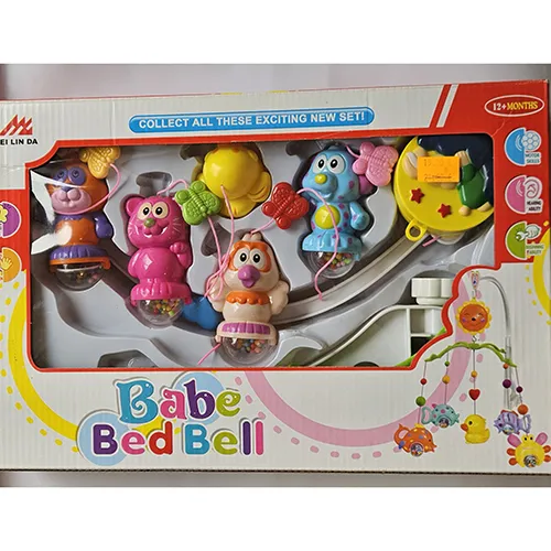 Carusel muzical agățat. Setul are mai multe zornăitoare colorate legate cu un șir și cu o minge mică în partea de jos a fiecăruia.