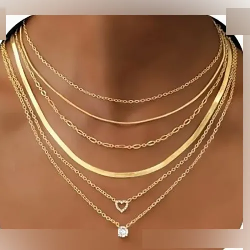 Set de șase coliere. Un colier metalic de culoare cupru cu un farmec imitație de piatră prețioasă. Un colier din metal auriu cu un farmec de imitație de piatră prețioasă. Un lanț metalic auriu, simplu. Un lanț de legătură plat de aur. Un colier din metal auriu cu un farmec de inimă. Produs vândut online, în special prin intermediul Temu.
