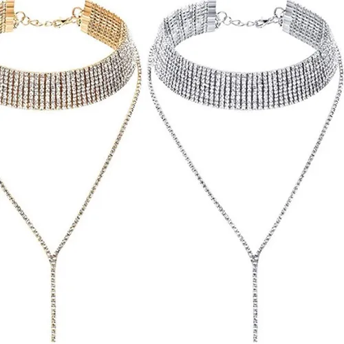 Colier choker multi-strand de culoare argintie cu strasuri. Produs vândut online, în special prin intermediul HobbyHall.fi.