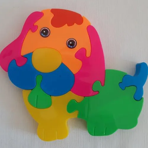 Covor de puzzle din plastic, format din zece piese, în diferite culori, în formă de câine.