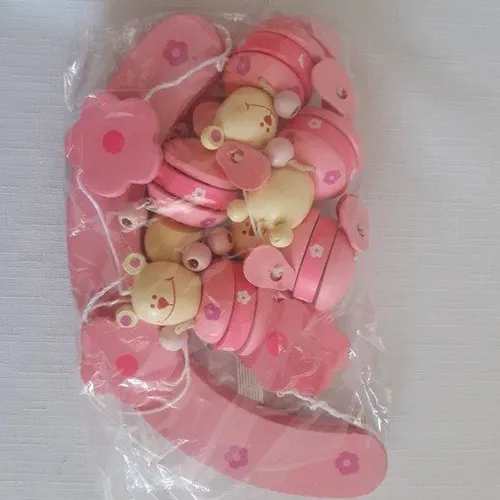 Jucărie din lemn roz cu cinci figurine de ursuleț de pluș.
