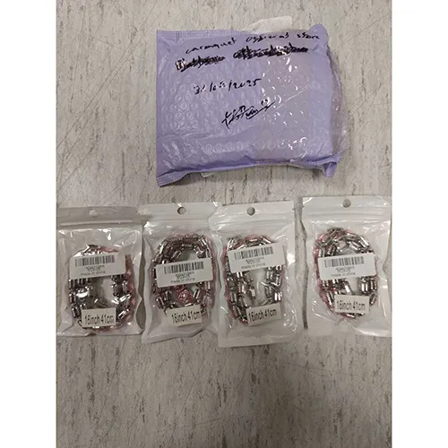 Colier metalic argintiu cu pietre roz. Produs vândut online, în special prin intermediul AliExpress.