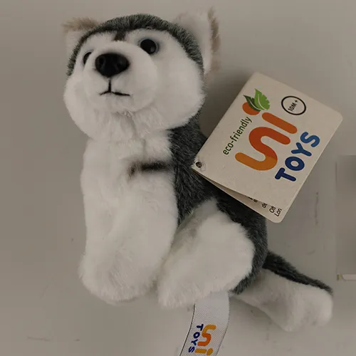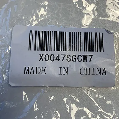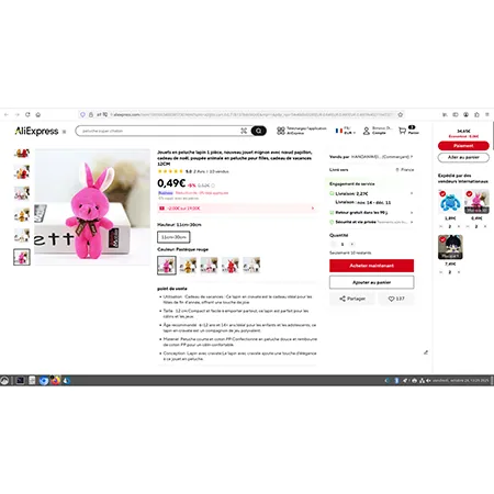 Set de două jucării moi roz, umplute, în formă de iepuri, cu un papion maro și un lanț de bile metalice atașat la o buclă de pânză albă între urechi. Produs vândut online, în special prin intermediul AliExpress (identificator unic de produs: 1005003409385730).