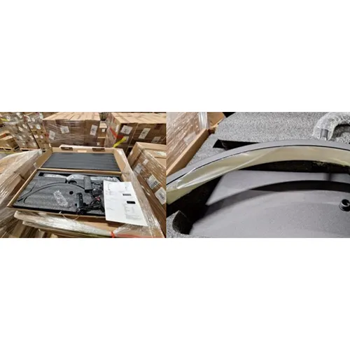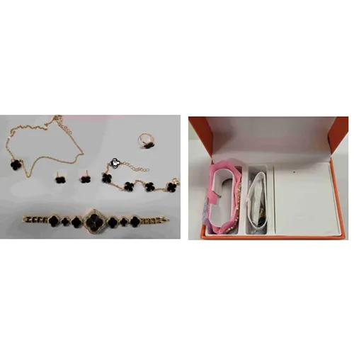 Set de bijuterii care conține un ceas, colier, brățară, cercei și inel de culoare aurie cu inserții din material negru.