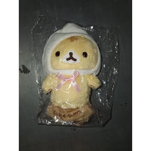 Jucărie de pluș, în formă de animal bej, cu glugă albă, arc roz și lanț metalic. Produs vândut online, în special prin intermediul AliExpress.