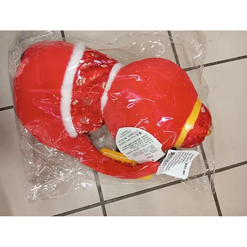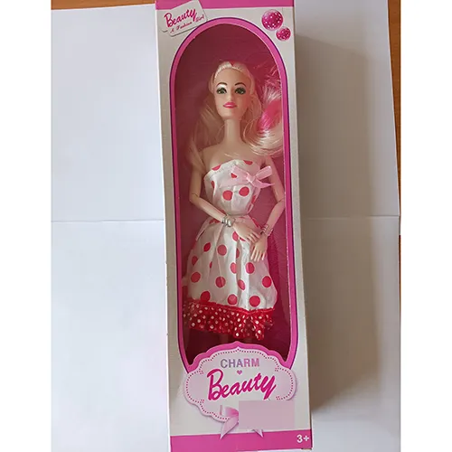 Păpușă din plastic moale și dur, cu păr blond lung, purtând pantofi și o rochie cu buline albe și roșii.