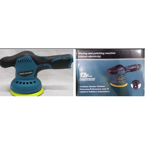 Mașină de lustruit orbitală albastră cu 12V, livrată cu 2 pachete de baterii litiu-ion de 12V și încărcător de priză. Produs vândut online, în special prin intermediul Amazon.