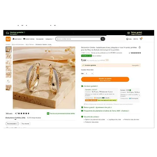 Pereche de cercei încrucișați din metal auriu, cu o bandă nemetalică de sclipici lipită de un inel. Sunt vizate toate loturile. Produs vândut online, în special prin intermediul TEMU (identificator unic de produs: 601099582004796).