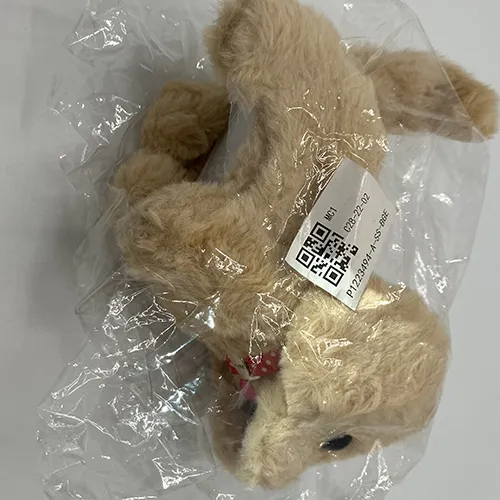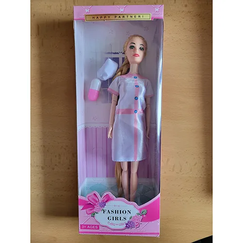 Păpușă de plastic de aproximativ 29 cm înălțime, cu o geantă de mână din plastic violet, păr lung blond împletit purtând un capac alb și o rochie medicală albă.