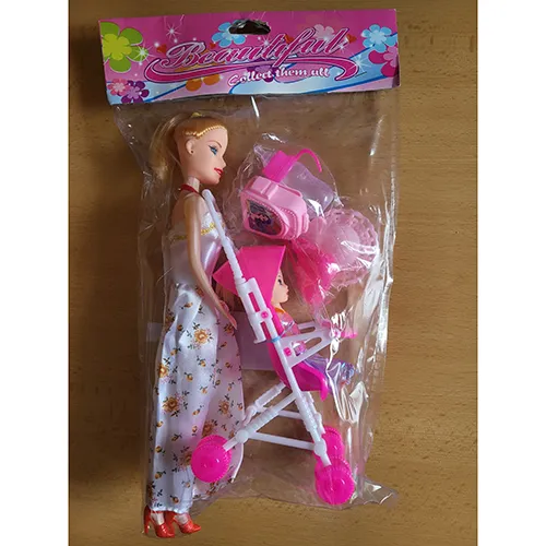 Păpușă din plastic de 26 cm cu păr într-o coadă de cal într-o rochie cu flori și accesorii din plastic și pantofi roșii.