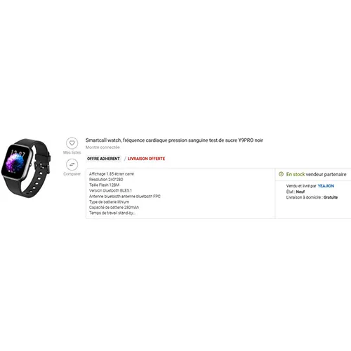 Ceas inteligent negru care pretinde că monitorizează nivelul zahărului din sânge într-un mod non-invaziv. Produs vândut online, în special prin intermediul Fnac.