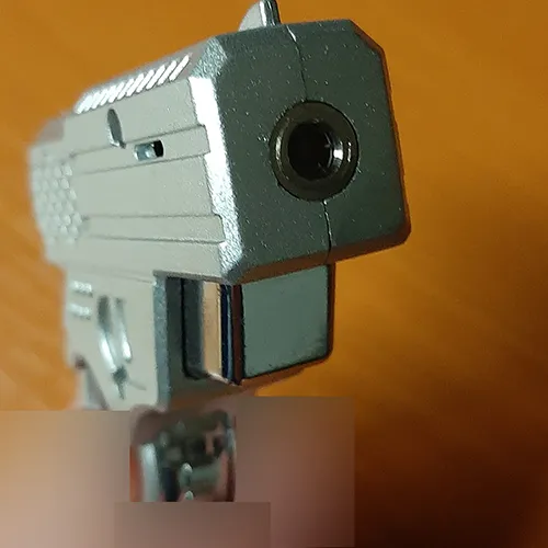 Brichetă în formă de pistol mic. Partea care este, de obicei, revista (partea de care pistolul este ținut atunci când trage) este în formă de cerc. Declanșatorul pistolului este butonul de operare. Când este apăsat, o flacără iese din țeava pistolului.