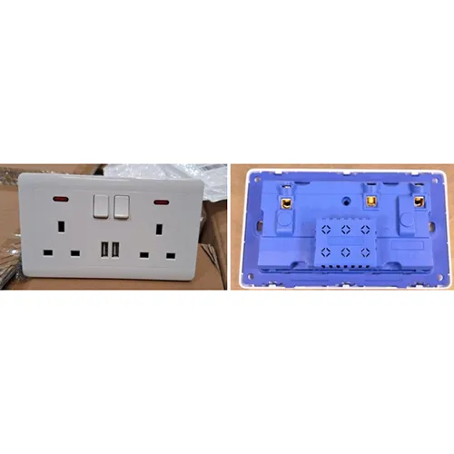 Priză de perete cu două prize, două porturi USB montate încastrat și două comutatoare care indică consumul de energie.