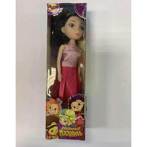 Papusa din plastic inspirata din seria animata Fairytale Patrol. Papusa este imbracata intr-o rochie roz si zmeura si are parul lung si inchis la culoare.