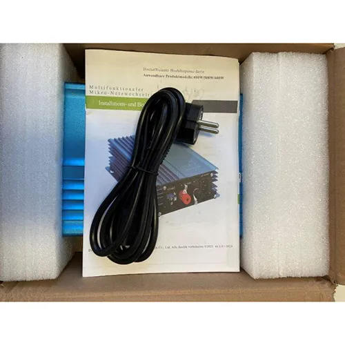 Invertor solar pentru conversia curentului continuu (CC) dintr-un sistem fotovoltaic în curent alternativ (CA) pentru alimentarea rețelei de alimentare. Tensiuni de intrare de la 16 la 28 volți DC și o tensiune de ieșire de la 180 la 260 volți. Produs vândut online, în special prin Amazon (ASIN: B0C9MPG46J).