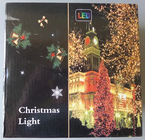 Lanțul de iluminat cu 140 de LED-uri neînlocuibile, o unitate intermitentă, un fir electric alb și o priză care permite extinderi cu membri suplimentari.
