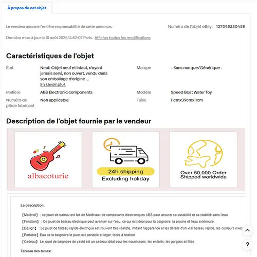 Jucărie de baie în formă de barcă de plastic roșie și albă, cu două motoare cu elice care necesită o baterie fiecare. Produs vândut online, în special prin intermediul eBay (identificator unic: 127095230458).