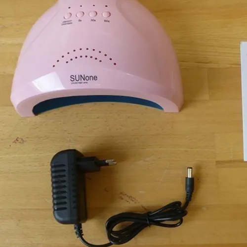 Lampă UV pentru unghii. Tensiune de intrare: 100-240 V CA, ieșire: 24 V c.c. Producția curentă: 2 A. Produs vândut online, în special prin intermediul AliExpress (identificator unic: 1005006072000368).