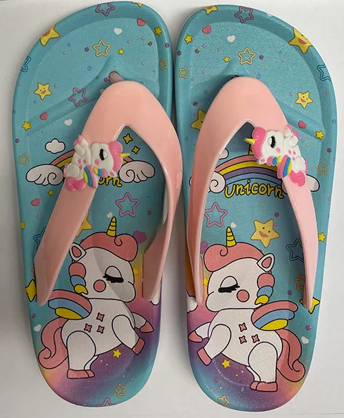 Șlapi pentru copii cu unicorn roz și albastru. Produs vândut online, în special prin intermediul Temu (Identificator de produs: 601099551054631).