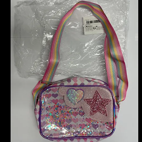 Geantă de mână pentru copii cu curea de umăr. Partea din față a pungii are un capac/căptușeală din plastic cu confetti în formă de floare, stea și inimă în spatele ferestrei din plastic. Produs vândut online, în special prin intermediul Temu.