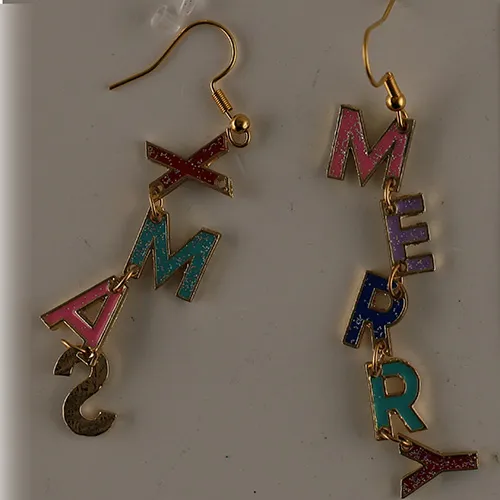 Cercei de culoare aurie cu litere strălucitoare.