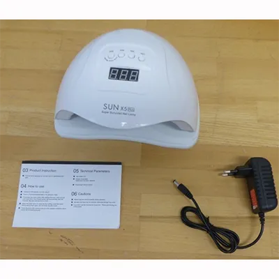 Uscător de lac de unghii cu LED-uri. Tensiune de intrare: 100 – 240 V c.a. Tensiune de ieșire: 24 V c.c. Curentul de ieșire: 0.7 A. Produs vândut online, în special prin AliExpress (identificator unic de produs: 1103038440).
