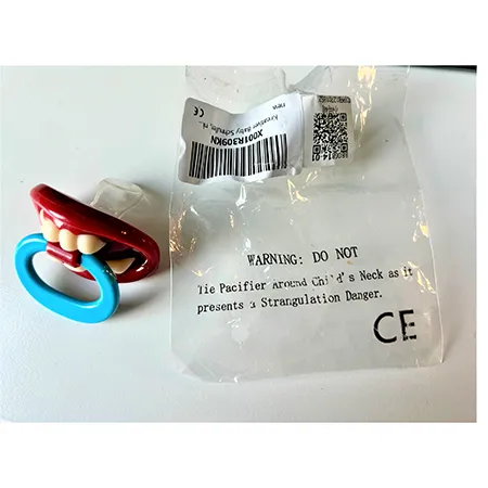 Suzetă, sub formă de gură cu dinți vizibili. Produs vândut online, în special prin Amazon (ASIN: B08KXH4QHS).