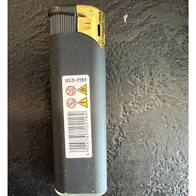 Brichetă cu gaz cu corp din plastic rigid negru. Bricheta are un mecanism de aprindere cu un element piezo.