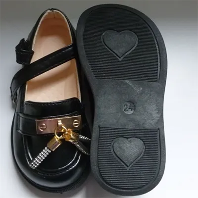 Pantofi pentru copii, de culoare neagră, cu un model de pălărie, cu curea de șa, ciucuri și închidere cu arici. Mărimile 21 și 24.