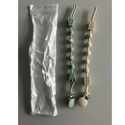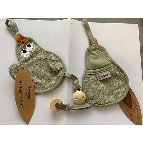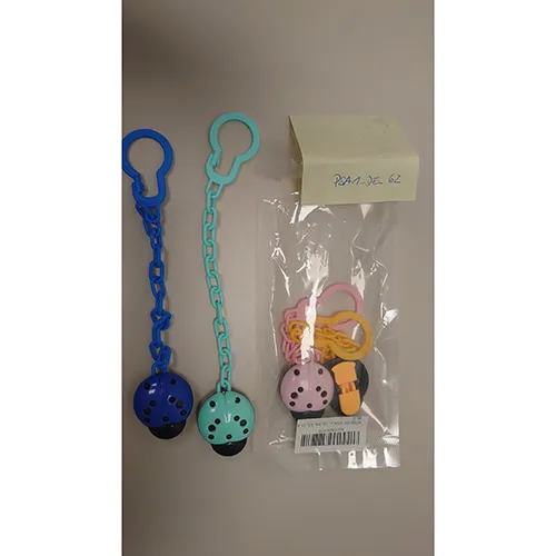 Suport pentru suzetă cu o clemă de fixare sub formă de buburuză. Produs vândut online, în special prin Amazon (ASIN: B0C3GJX72M).