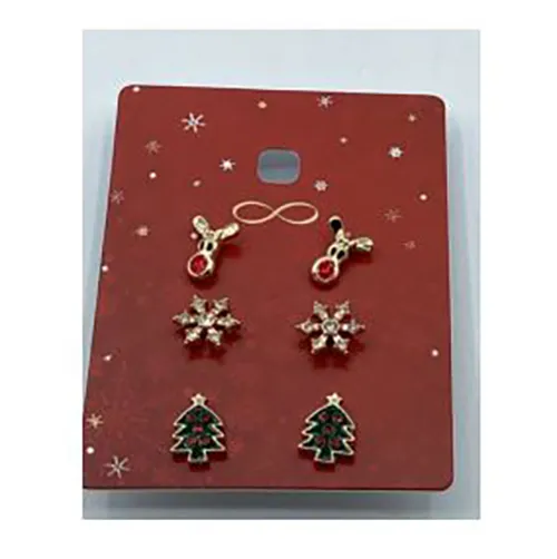 Trei perechi de cercei stud cu motive de Crăciun (ren, fulg de zăpadă, pom de Crăciun).