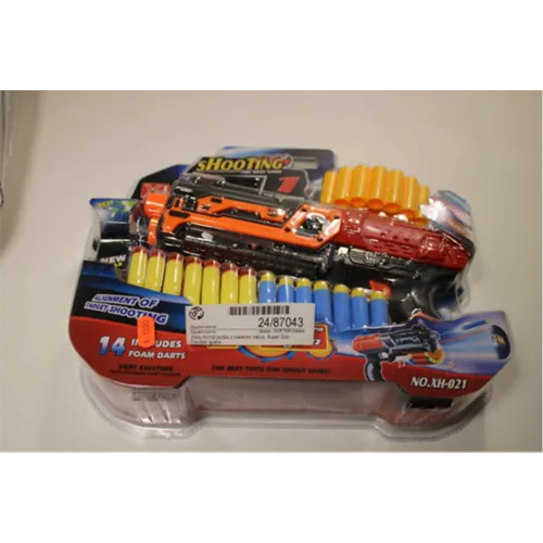 Pistol de jucărie din plastic cu glonț moale și 14 săgeți din spumă.