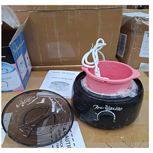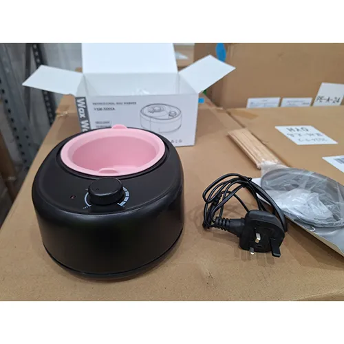 Încălzitor de ceară cu o bază neagră și o ceașcă de plastic roz. Produs vândut online, în special prin intermediul Amazon.