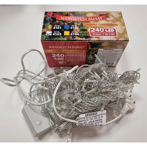 Lanț de iluminat cu șiruri, cu 240 de lumini LED, tensiune nominală 250 VAC, curent nominal 2,5 A, putere nominală 6 W, promovat ca având clasa de siguranță II.