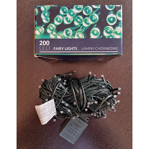 Lanț de iluminat cu șiruri cu 200 de lumini LED neînlocuibile, tensiune nominală 220-240 V, putere nominală 3 W, promovată ca având clasa de siguranță II.