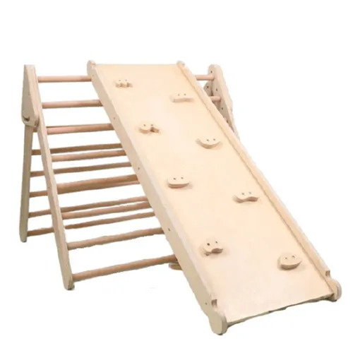 Un cadru din lemn triunghi pikler pentru un copil mic pentru a urca. Destinat pentru joacă în interior. Furnizat cu o rampă și o placă de alpinism. Produs vândut online, în special prin intermediul learningworld.ie