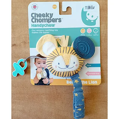 Suport pentru suzetă cu elemente de joacă, confecționat dintr-o țesătură în formă de cap de leu, atașat cu o buclă de țesătură, un suport pentru urechi de leu și un suport pentru suzetă.