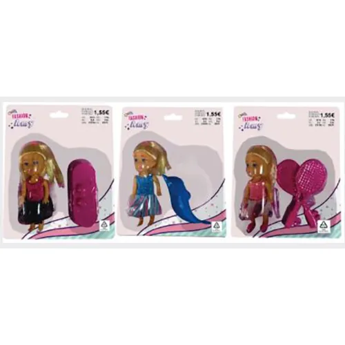 Păpușă mică din plastic în formă de fată cu elemente atașate în funcție de varianta produsului: delfin, rachetă de tenis sau skateboard.