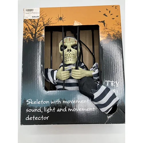 Baterie operată de Halloween produs de decorare cu un schelet într-o cușcă. Produsul are funcții de sunet, lumină și mișcare.