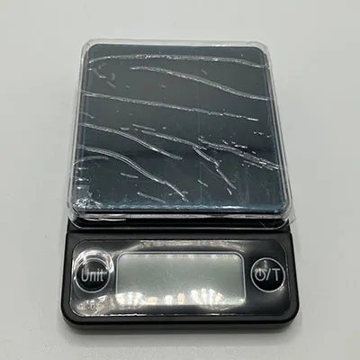Cantar digital mic (6,8x10x2 cm) cu exterior din plastic negru, capac transparent pentru placa de cantarire, afisaj LCD si o pereche de butoane.