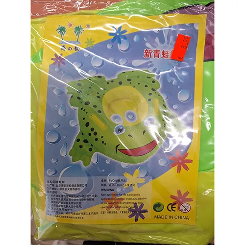Scaun de înot gonflabil în formă de broască. Scaunul are două găuri în partea de jos pentru ca picioarele copilului să ajungă la apă.