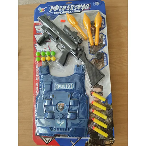 Jucărie de poliție set cu o pușcă de plastic rigid negru cu un shooter cu arc încărcat, cinci proiectile cu un arbore de spumă și o ventuză portocalie la sfârșitul anului, șase proiectile de plastic galben și verde în formă de minge, trei rachete galbene, și o vestă de plastic albastru.