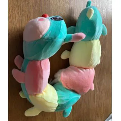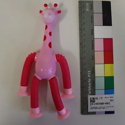 Jucărie de girafă cu ventuză telescopică, confecționată din diverse materiale: plastic dur, plastic moale; capul clipește atunci când jucăria este scuturată. Produs vândut online, în special prin intermediul Wish.