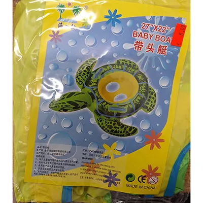 Scaun de înot gonflabil în formă de broască țestoasă. Scaunul are două găuri în partea de jos pentru ca picioarele copilului să ajungă la apă.