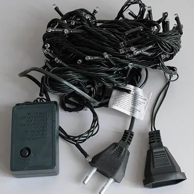 Lanțul de iluminat decorativ cu unitate de control echipată cu 108 LED-uri albastre, fire izolate verde și o priză care permite extinderea cu membri suplimentari.