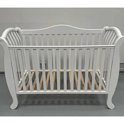 Pătuț din lemn pentru copii în design alb, pe roți. Produs vândut online.